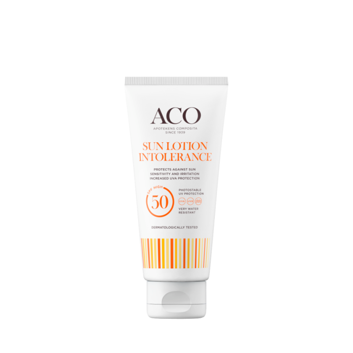 ACO Sun Intolerance Lotion SPF50 on hajusteeton ja kosteuttava aurinkosuojavoide aurinkoherkälle iholle.