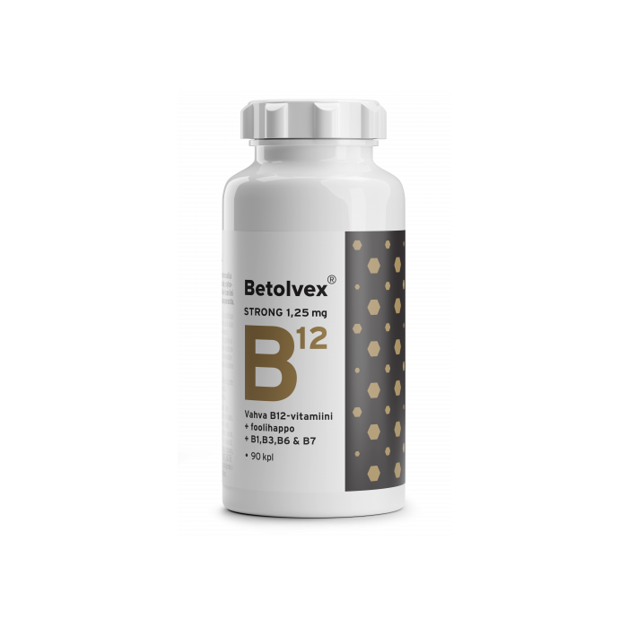 Betolvex Strong 1,25 mg on vahva ja monipuolinen B12-vitamiinivalmiste. B12-vitamiini tukee hermoston normaalia toimintaa. B1-vitamiini tukee normaaleja psykologisia toimintoja. Foolihappo ja B6-vitamiini auttavat vähentämään väsymystä ja uupumusta. Ravintolisä.