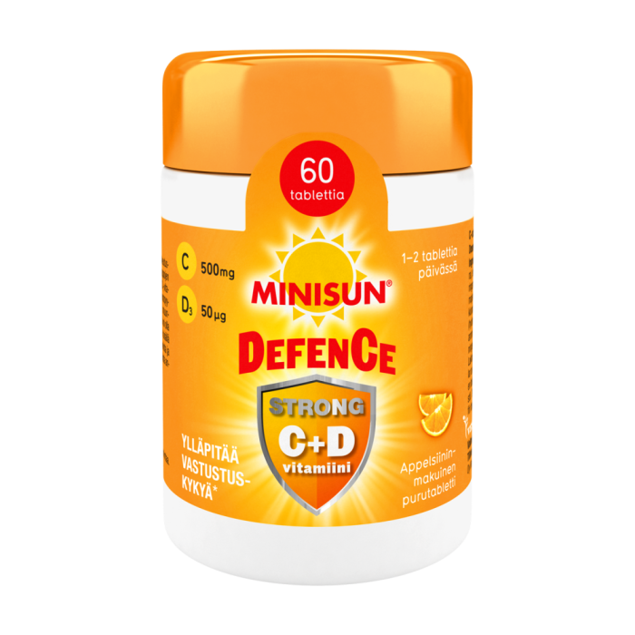 Minisun Defence C + D Strong on vahva yhdistelmä C- ja D-vitamiinia. Se on oikea superpakkaus vastustuskyvyn tueksi. Minisun Defence sisältää 500 milligrammaa C-vitamiinia ja 50 mikrogrammaa D3-vitamiinia. Molemmat vitamiinit ylläpitävät vastustuskykyä. Lisäksi C-vitamiinin on todettu vähentävän väsymystä ja uupumusta, ja D-vitamiini on tärkeä luuston rakentaja sekä lihasten toiminnan ylläpitäjä. Minisun Defence sopii päivittäiseen käyttöön ja kuureina silloin, kun keho tarvitsee erityistä tukea. Appelsiininmakuinen purutabletti maistuu hyvältä ja sopii aikuisille. Vuorokausiannos on yhdestä kahteen purutablettia. Valmiste on gluteeniton, laktoositon, maidoton ja soijaton.