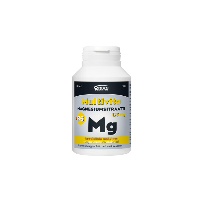 Multivita Magnesiumsitraatti+B6 175 mg on vahva magnesiumsitraattipurutabletti ja urheilijan ja kuntoilijan luottotuote! Yksi raikkaan ja hedelmäisen appelsiinin makuinen purutabletti sisältää 175 mg magnesiumia hyvin imeytyvässä sitraattimuodossa sekä 2 mg magnesiumin imeytymistä tukevaa B6-vitamiinia. Helposti suussa hajoavassa purutabletissa on miellyttävä rakenne, eikä se jätä jauhoista tai rakeista suutuntumaa. Ravintolisä.  Tuotteen sisältämä magnesium vähentää väsymystä ja uupumusta, edistää energia-aineenvaihduntaa ja tukee lihasten ja hermoston normaalia toimintaa. Kaikki sarjan tuotteet sopivat myös vegaaneille. Laktoositon (maidoton), gluteeniton, hiivaton ja sokeriton. Makeutettu ksylitolilla, sorbitolilla ja sukraloosilla. Pakkauskoko: 80 purutabl.