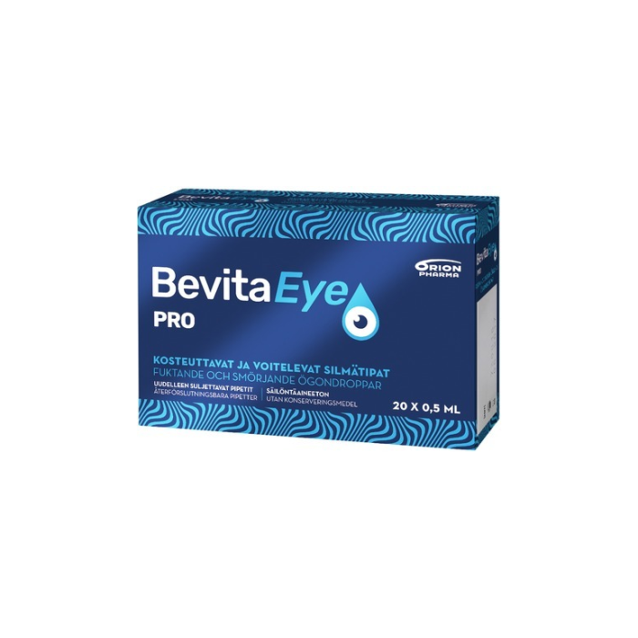 Bevita Eye Pro ögondroppar lindrar torrhet, brännande känsla eller känsla av skräp i ögonen som orsakas av miljöfaktorer, stressfaktorer riktade mot ögonen eller mekaniska orsaker. Ögondropparnas koncentrationer är justerade så att de även smörjer vid mycket kraftiga obehagsymptom.