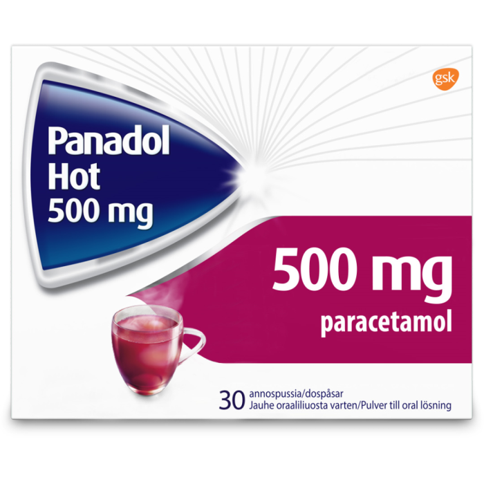 Panadol Hot används vid vård av tillfälliga värk- och febertillstånd vid förkylningssjukdomar, vid vård av influensa, huvudvärk och muskelvärk. Användningsändamål: Dess verksamma ämne är paracetamol, av vilket det finns 500 mg i en dos. Dospåsen löses upp i hett vatten. Drycken smakar svartvinbär och doftar mentol. Panadol Hot är sötad med aspartam och sackaros. Till barn under 4 år och för långvarigt bruk endast enligt läkares föreskrift. Dosering: Dospåsens innehåll löses upp i ett glas hett vatten och drycken intas varm Vanlig dos för vuxna är 1-2 dospåsar med 4-6 timmars mellanrum högst 3 gånger per dag Till barn över 4 år är dosen 15 mg/kg högst 3 gånger per dag Till barn som väger 17-25 kg ½ dospåse högst 3 gånger per dag Till barn som väger 25-32 kg ½-1 dospåse högst 3 gånger per dag Till barn som väger över 32 kg 1 dospåse högst 3 gånger per dag Bör observeras: Ifall symptomen fortsätter länge eller ifall de uppträder ofta bör läkare kontaktas Övriga paracetamolpreparat bö